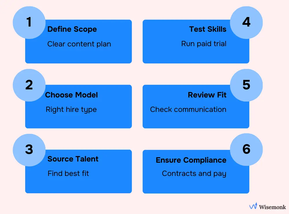 - Follow a structured hiring process: define scope, pick the right model, source and test candidates with paid projects, evaluate communication and revisions