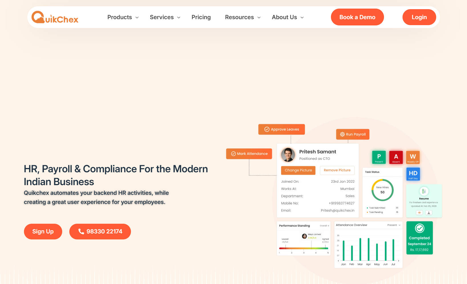 - India-optimized payroll processing with automated PF, ESI, professional tax, and TDS calculations