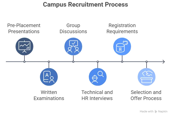 - Structured timeline: Process begins in students' second-last academic year with pre-placement talks, written tests, group discussions, and final interviews