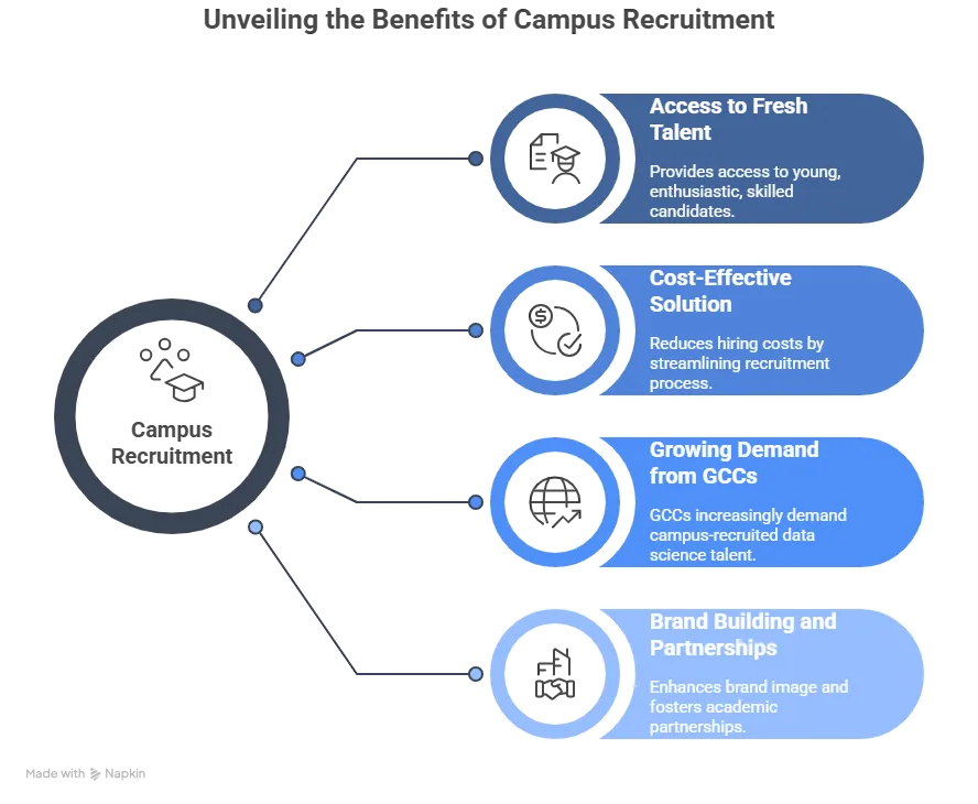 - Cost-effective talent access: Campus recruitment provides direct access to fresh graduates with current skills at 30% lower costs than traditional hiring