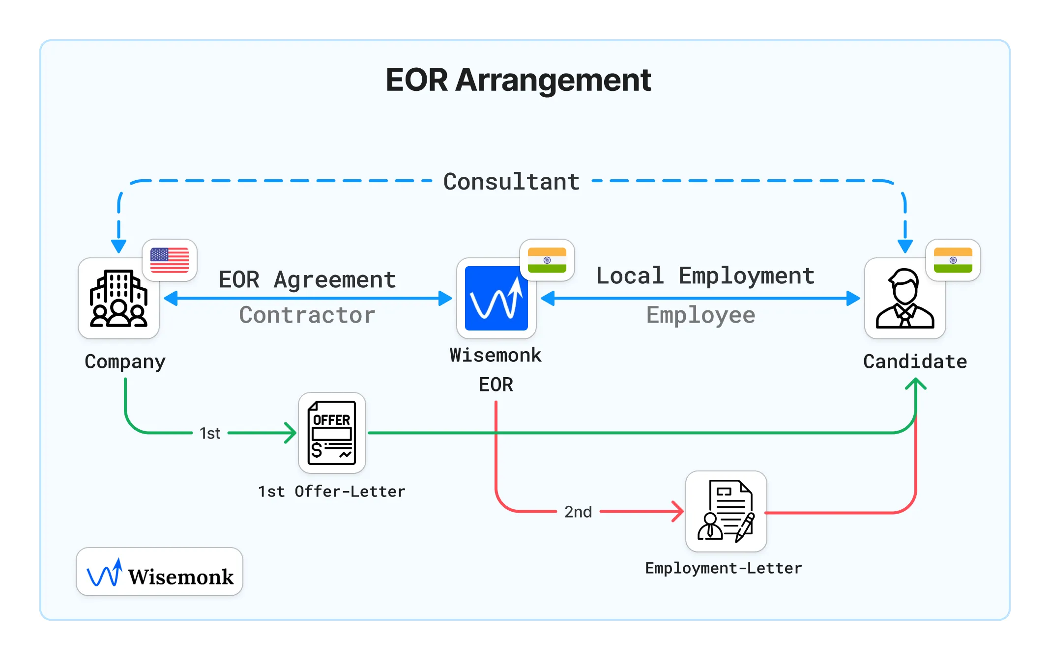 - The EOR partner acts as the legal employer in India, handling compliance, payroll, and other administrative tasks on behalf of the client company.
