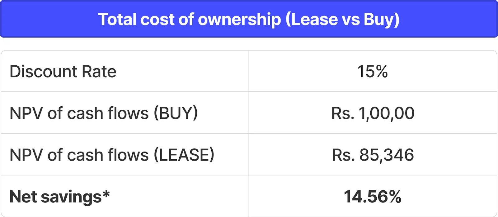 Let us assume you are planning to purchase a laptop worth Rs. 1,00,000. The same laptop is available through Wisemonk, under the following lease terms.