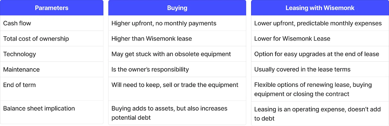 In this guide, we delve deeper into these factors by considering a leasing option provided by WiseMonk. This option allows businesses to pay 30% of the equipment cost annually for three years, and an opportunity to buy the equipment at 10% at the end. We'll compare this to outright buying to give you a more comprehensive understanding.