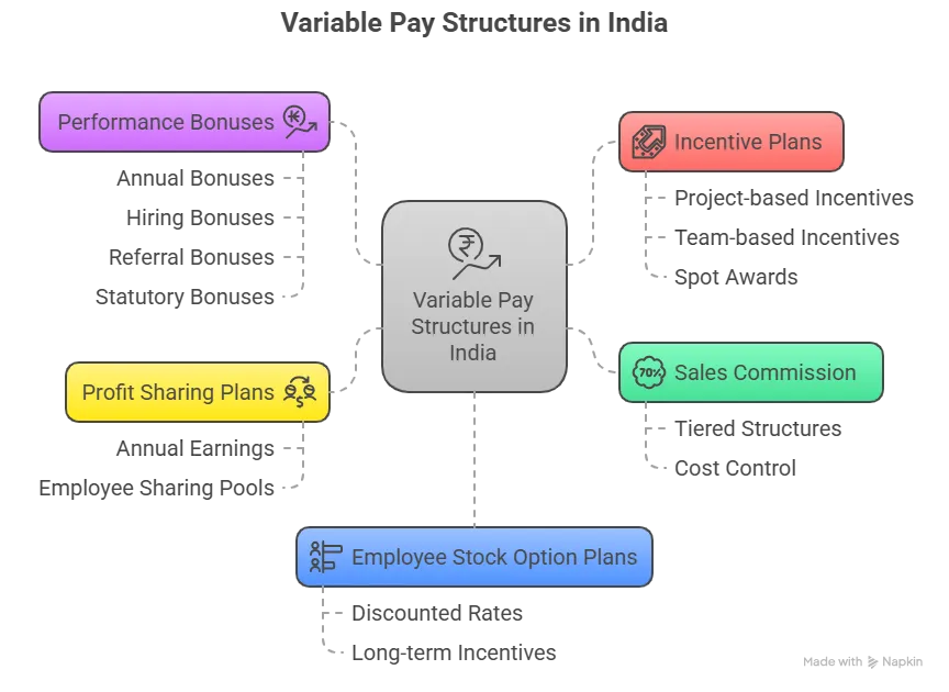 Based on our research across various Indian organizations, there are several distinct types of variable pay structures commonly implemented: