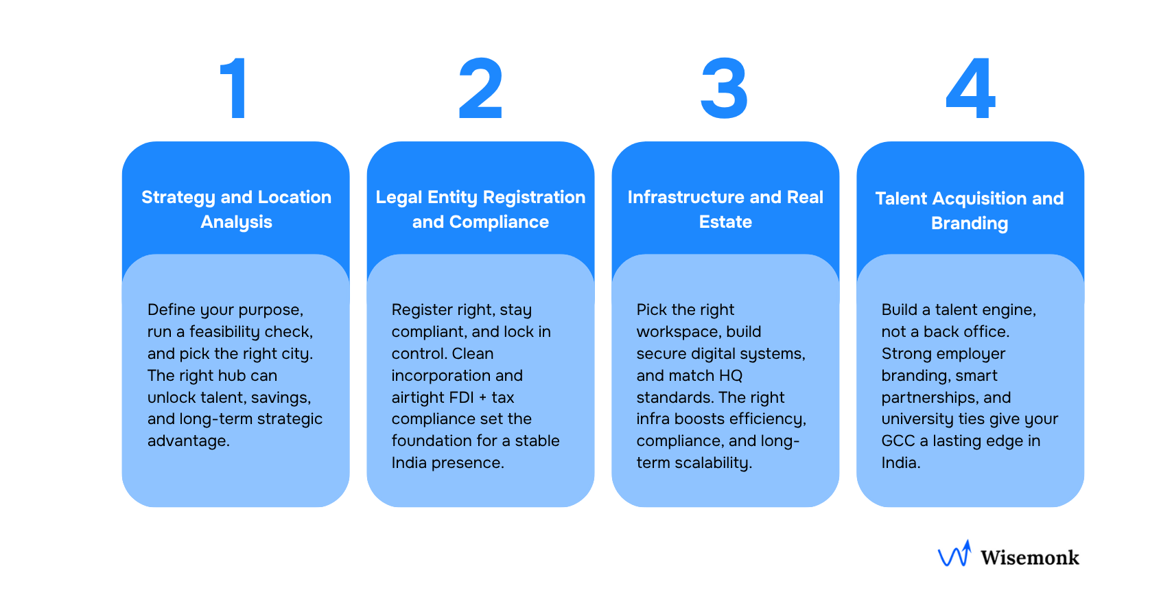 From our experience guiding global companies through successful GCC setups in India, here is the step-by-step roadmap to establishing your center: